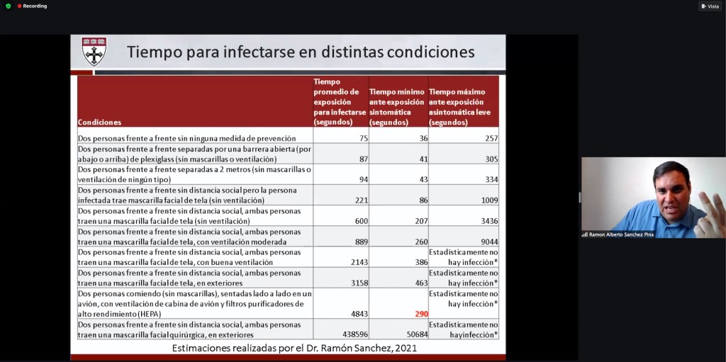 Dijo también que la principal fuente de contagio son los aerosoles que generamos al hablar, respirar, estornudar o toser, por lo que recomendó ampliamente el uso de cubrebocas, mejorar la ventilación de los espacios, la desinfección y los filtros de aire. En este sentido, dio cifras sobre el tiempo en que una persona con síntomas, sin cubrebocas, en un espacio cerrado y con poca ventilación puede contagiar a otra. Si hay dos personas frente a frente, explicó, sin ninguna medida de protección, pueden contagiarse en un tiempo promedio de 75 segundos. Lo más rápido son 36 segundos. Además, si se está ante una persona asintomática leve, el tiempo de contagio es de 257 segundos.