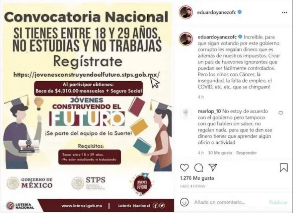 “Increíble, para que sigan votando por este gobierno corrupto. Les regalan dinero que es además de nuestros impuestos. Crear un país de huevones ignorantes que puedan ser fácilmente controlados. Pero los niños con cáncer, la inseguridad, la falta de empleo, el Covid, etc. ¡Qué se chinguen!”, publicó el actor.