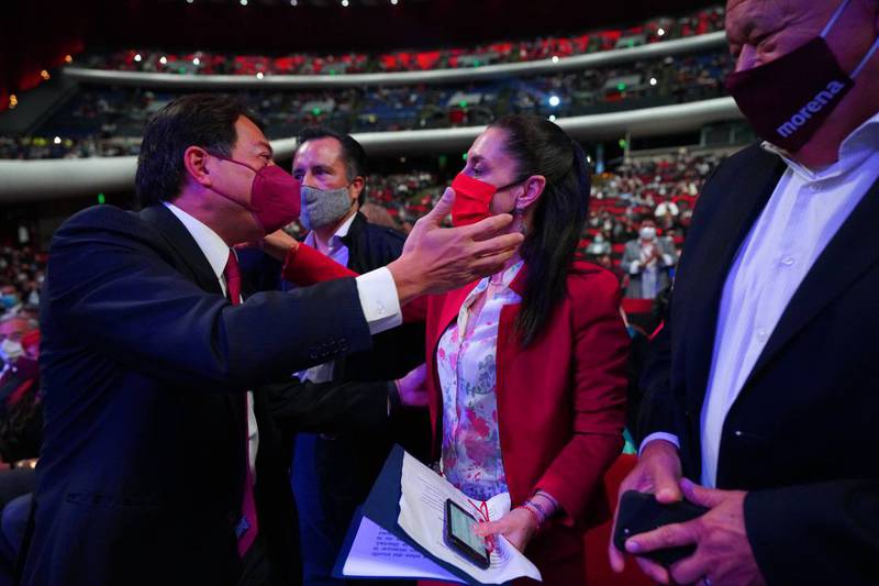 El discurso de Mario Delgado fue interrumpido, primero, con porras de “¡Presidente!”, y luego con gritos y hasta abucheos, lo que provocó nerviosismo y equivocaciones en su lectura. Sin embargo, no desaprovechó, tomó de la mano a la funcionaria y le alzó el brazo para festejar la victoria.