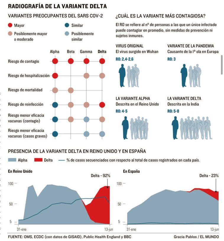 En Reino Unido, donde se registraron los primeros casos en febrero, la variante Delta ha superado rápidamente a la antigua variante Alfa, detectada por primera vez en Kent, Inglaterra y, según un estudio publicado en Science, es entre un 43 y un 90 por ciento más transmisible que la cepa original de Wuhan.
