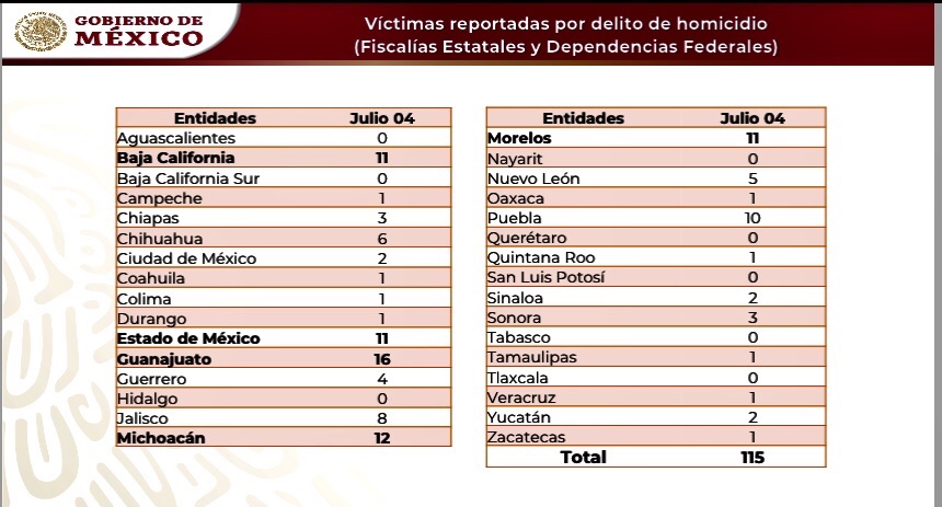 Cifras del Gobierno de México detallan que el 4 de julio fueron asesinadas 115 personas, el tercer día más violento en lo que va del sexenio.