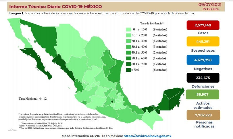 El Reporte Técnico Diario sobre el estado de la pandemia reporta 9 mil 319 nuevos contagios confirmados, para un total de 2 millones 577 mil 140. Se notificaron 217 decesos adicionales, para un acumulado de 234 mil 675.