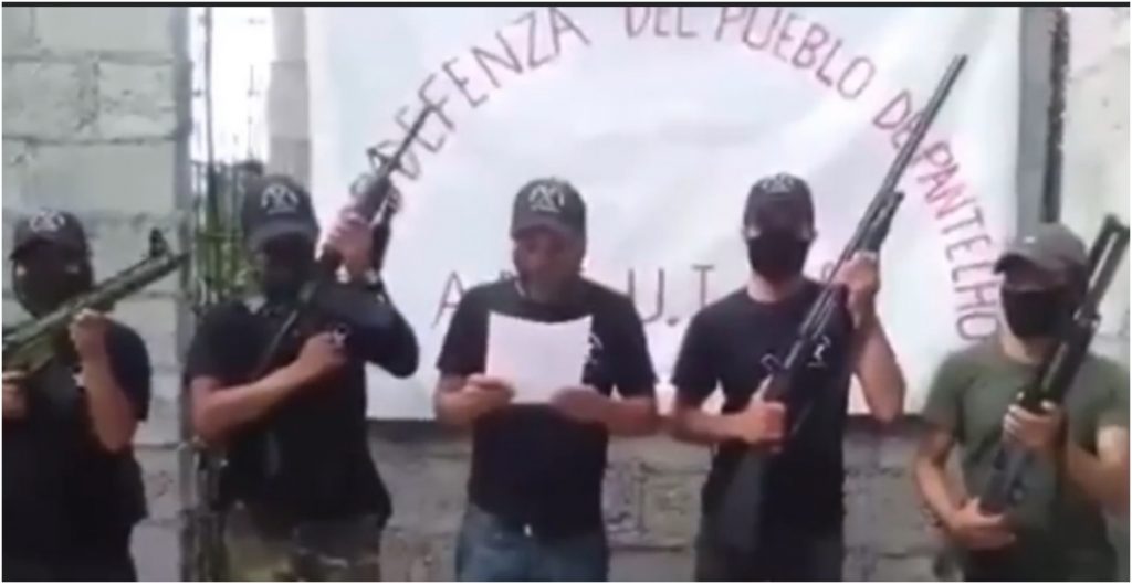 En el video aparecen cinco personas, todas con el rostro cubierto. Cuatro de ellas portaban un arma larga. Detrás de ellos hay una lona con la leyenda “Autodefenza (sic) del pueblo de Pantelhó”, colgada en una construcción sin terminar.