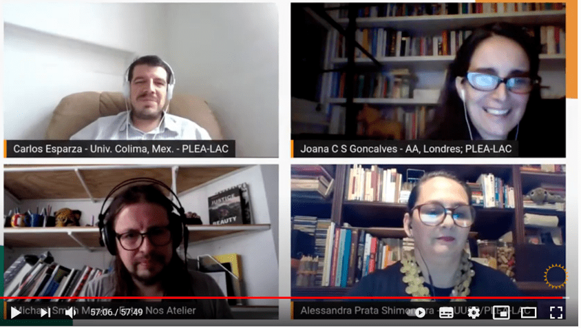 Integrantes del Capítulo PLEA Latinoamérica y el Caribe reflexionaron hace unos días sobre la sostenibilidad como principio insostenible y la justicia espacial, con el director de Entre-Nos Atelier en San José, Costa Rica, Michael Smith Masis, en el foro virtual de la Facultad de Arquitectura y Urbanismo de Sao Paulo, Brasil. En esta charla participó el profesor de la Universidad de Colimam Carlos Esparza López, miembro y representante en México de este capítulo.