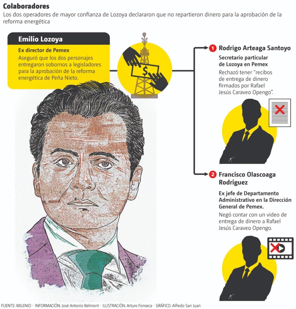 Se trata de Rodrigo Arteaga Santoyo, quien fuera secretario particular de Lozoya, y Francisco Olascoaga Rodríguez, ex jefe del Departamento Administrativo en la Dirección de Pemex. En su denuncia realizada en agosto de 2020, Lozoya ofreció “presentar” al Ministerio Público de la Federación a Arteaga Santoyo y Olascoaga Rodríguez para que “el primero aportara los recibos que se firmaban para la entrega de los recursos mencionados, y el segundo, un video en el que se apreciará el momento exacto de una de las entregas de dinero al enlace de (Partido) Acción Nacional”