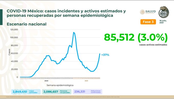 El domingo 11 de julio los casos activos estimados eran 60 mil 008, es decir, 25 mil 504 menos que los registrados este 18 de julio.