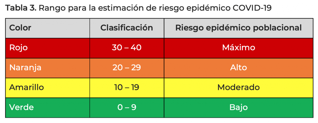 El nivel de alerta máximo, color rojo, permitía únicamente las actividades económicas esenciales y las personas podían salir a caminar alrededor de sus domicilios durante el día. Para el nuevo modelo el aforo de espacios se debe disminuir a menos del 30% y las actividades esenciales se reducen al 50%.