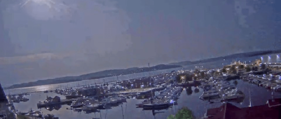 Una cámara web en Holmestrand, al sur de Oslo, capturó una bola de fuego que caía del cielo y se convertía en un destello brillante que iluminaba un puerto deportivo.
