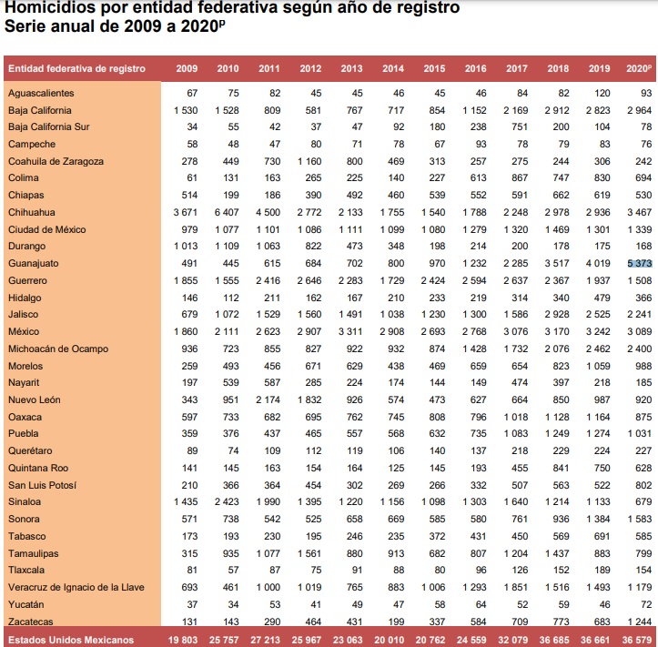 Guanajuato fue la entidad con mayor número de asesinatos, 5 mil 373; seguida de Chihuahua con 3 mil 467 y el Estado de México con 3 mil 89.