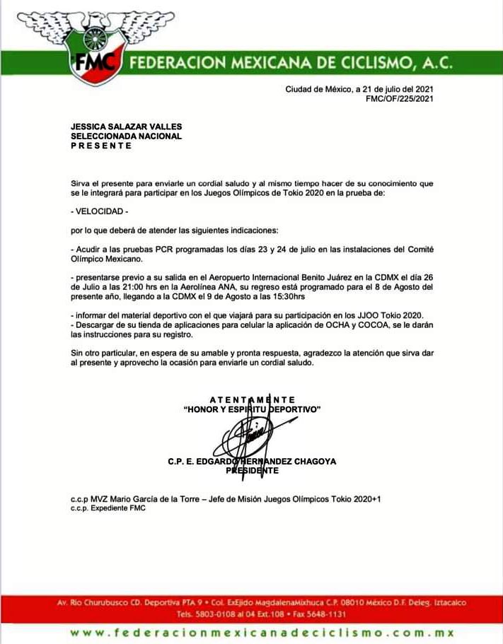 “Sírvase la presente para enviarle un cordial saludo y al mismo tiempo hacer de su conocimiento que se le integrará para participar en los Juegos Olímpicos de Tokio en la prueba de VELOCIDAD“, se lee en la misiva.