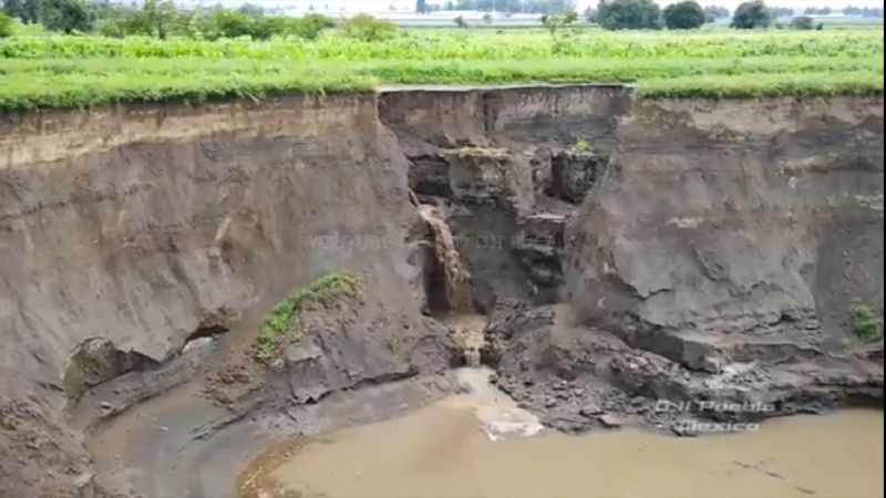 A través de un video grabado con un dron de México DJI Puebla, se puede observar que el agua fluye como si fuera un arroyo en los campos de cultivo y va a desembocar en la oquedad en forma de cascada.