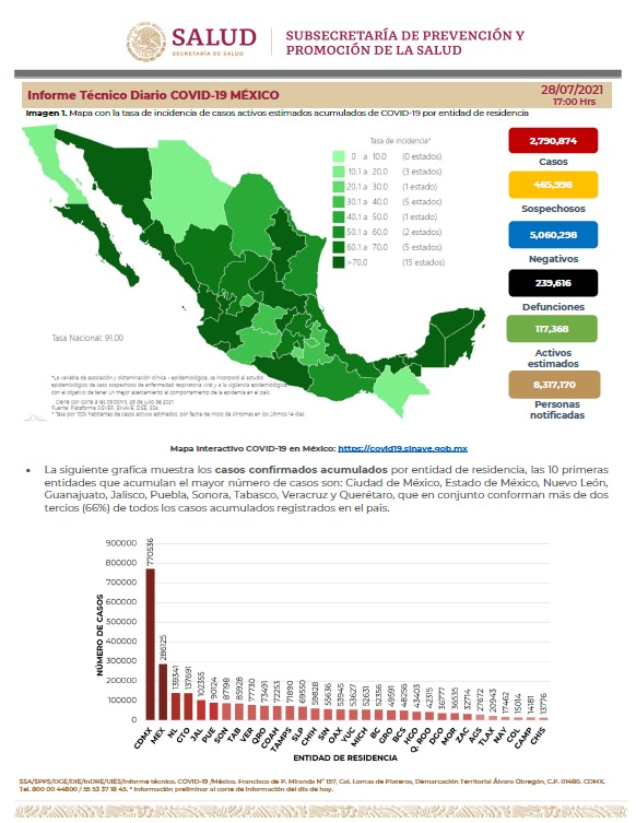 La Secretaría de Salud informó este miércoles que México alcanzó los 2 millones 790 mil 874 casos y 239 mil 616 muertes confirmadas por COVID-19.