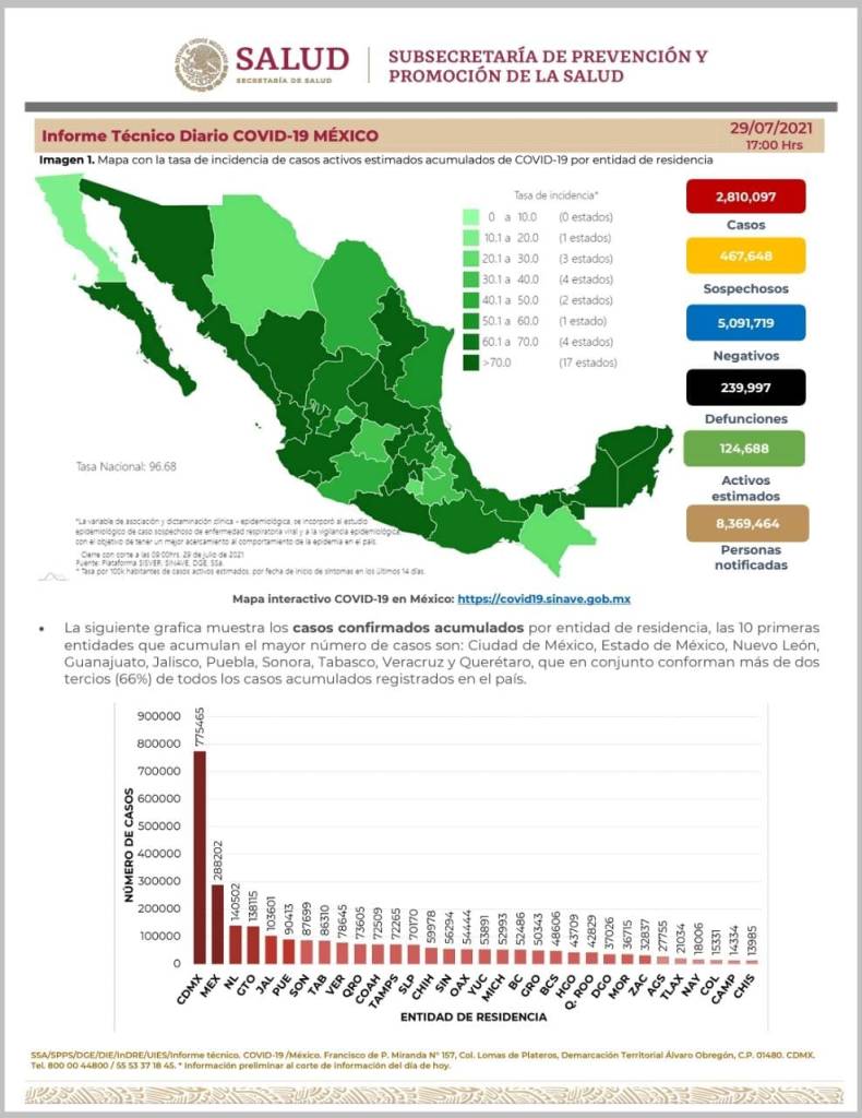 La Secretaría de Salud informó este jueves que México alcanzó los 2 millones 810 casos y 239 mil 997 muertes confirmadas por COVID-19.