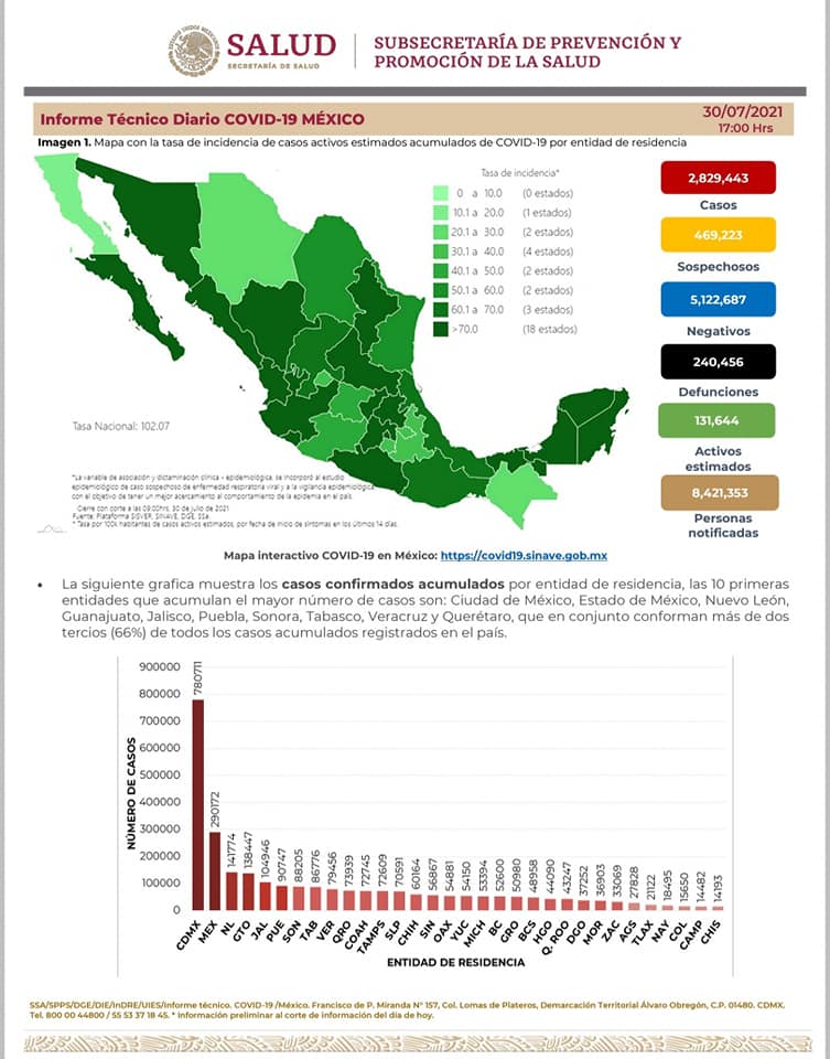 México superó este viernes los 2 millones 829 mil 443 contagios y 240 mil 456 muertes por Covid-19, según la Secretaría de Salud federal.