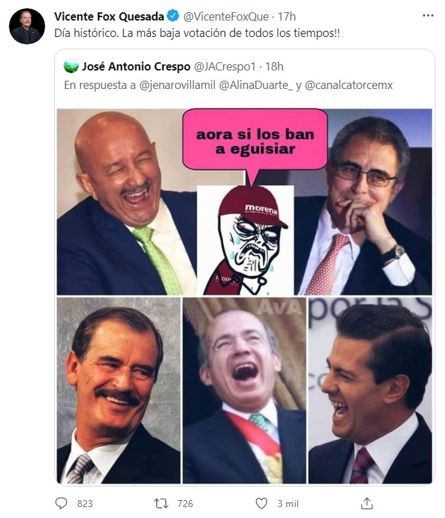 Fox fue el primer ex jefe del Ejecutivo en pronunciarse. “Día histórico, la más baja votación de todos los tiempos”, escribió el ex mandatario en sus redes sociales.