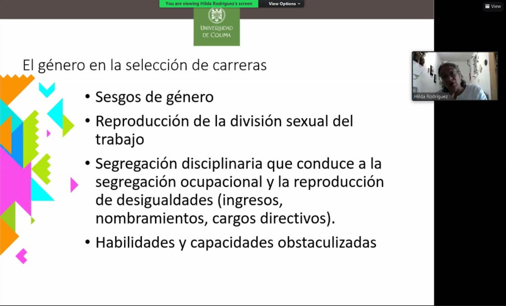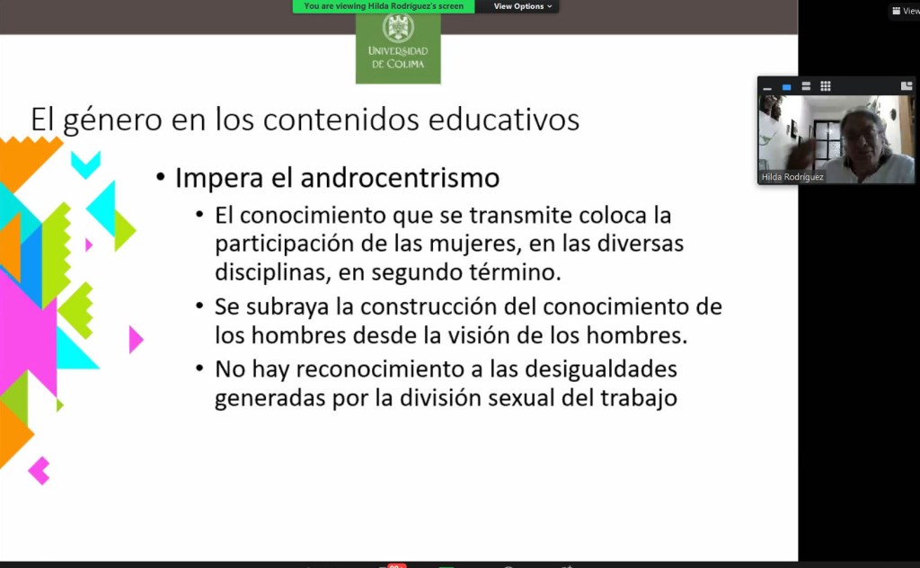 En el marco de la Jornadas Académicas 2021 que organiza la Dirección General de Desarrollo del Personal Académico de la Universidad de Colima, se llevó a cabo este martes la videoconferencia “Educación con perspectiva de género”, impartida por la catedrática e investigadora de la Facultad de Economía de la UNAM, Hilda Eugenia Rodríguez Loredo.