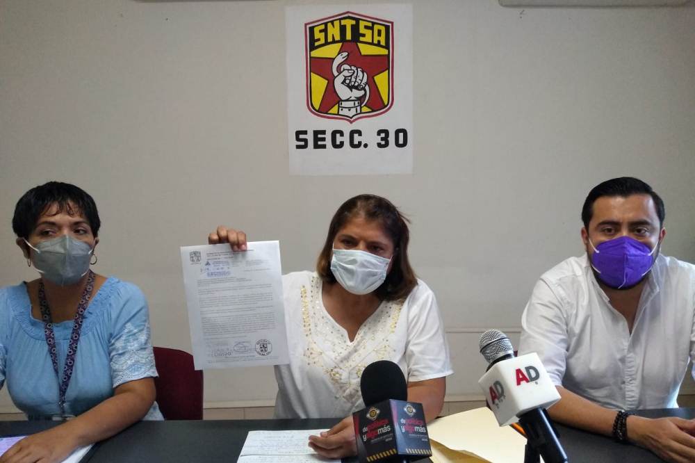 En rueda de prensa, la dirigente sindical dijo que “estamos enfrentando una problemática de manera pacífica, esperando los tiempos del pago del Fondo de Ahorro de los trabajadores, que son mil 696 afectados el día de hoy a quienes no se les ha pagado completamente esta prestación”.