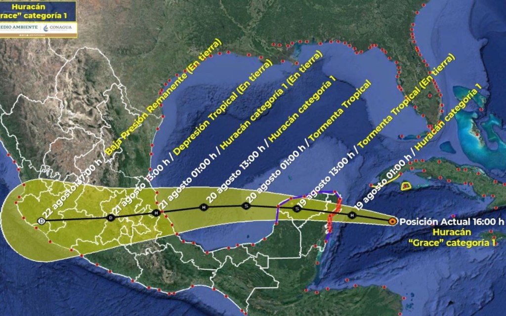 Este miércoles alrededor de las 19:00 horas el huracán Grace, categoría 1 en la escala Saffir-Simpson, tocará tierras mexicanas al entrar por las costas de Quintana Roo, pronosticó el Servicio Meteorológico Nacional de la Comisión Nacional del Agua (Conagua).