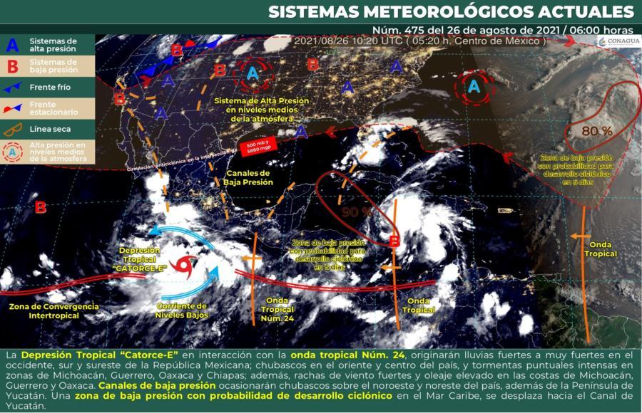 Este día, la depresión tropical 14-E se ubicará al suroeste de las costas de Guerrero, su circulación interaccionará con la onda tropical número 24 que recorrerá el oriente y sur del territorio nacional, originando lluvias fuertes a muy fuertes en el occidente, sur y sureste de la República Mexicana; chubascos en el oriente y centro del país y tormentas puntuales intensas en zonas de Michoacán, Guerrero, Oaxaca y Chiapas; además de rachas de viento fuertes y oleaje elevado en las costas de Michoacán, Guerrero y Oaxaca.
