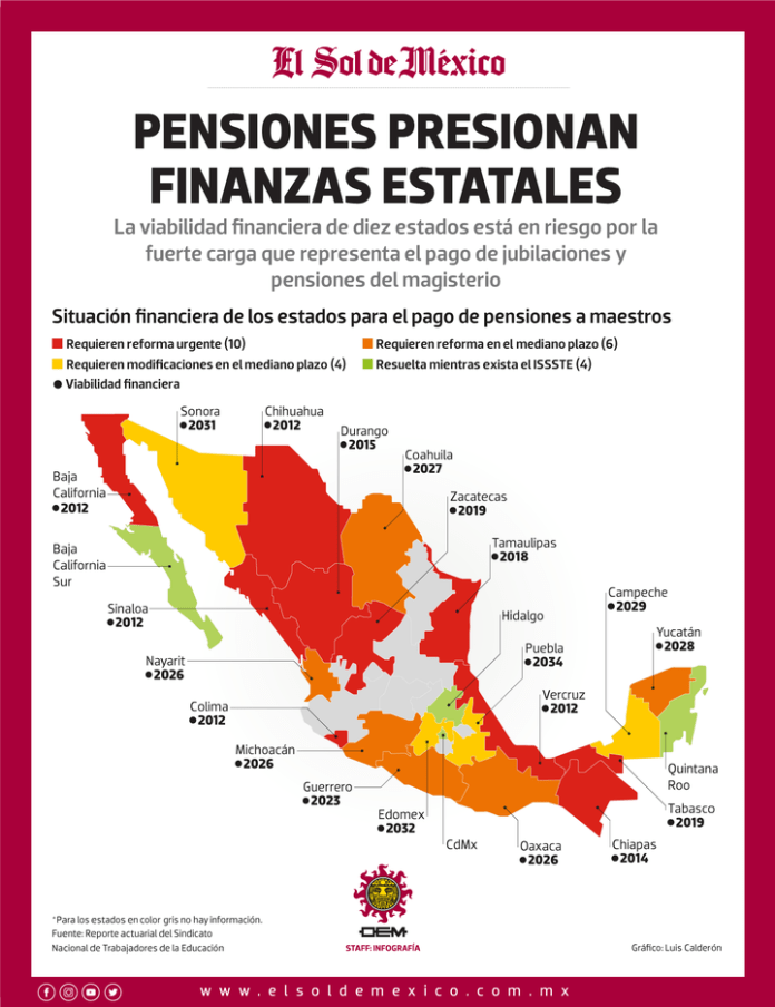 Según el estudio actuarial del SNTE, que es público en su página de transparencia, también se encuentran en situación de crisis Baja California, Colima, Chiapas, Chihuahua, Sinaloa, Tamaulipas, Veracruz y Durango.
