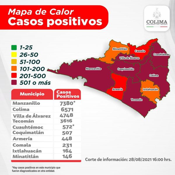 Además, se informa que 187 mujeres fueron diagnosticadas como positivas al virus de SARS-CoV-2, entre los 5 y más de 65 años de edad; 181 reciben atención ambulatoria, 4 están hospitalizadas graves, 1 no grave y 1 intubada. Por residencia, 55 son de Tecomán, 46 de Colima, 35 de Villa de Álvarez, 32 de Manzanillo, 9 de Coquimatlán, 5 de Armería, 3 de Cuauhtémoc, 1 de Comala y 1 de Minatitlán.
