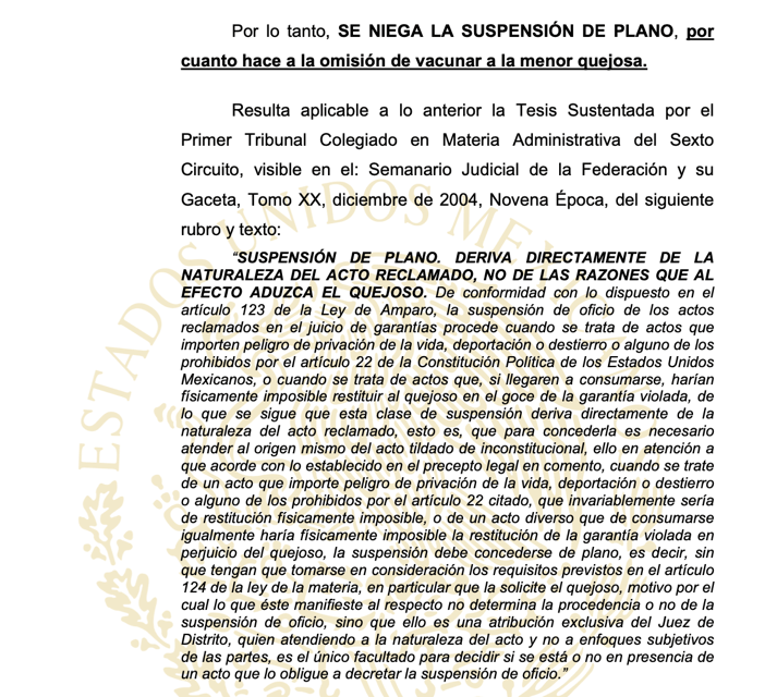 Por increíble que parezca, para este juez es irrelevante que la aplicación de una vacuna sea una medida preventiva; que existe algo que se llama interés superior del menor; que la niña acreditó que es alumna de un colegio y que regresará a clases la próxima semana. El juez consideró que “no se advierte de la demanda de amparo que la menor presente algún padecimiento o complicación de salud”, lo que resulta hasta contradictorio, porque precisamente, la finalidad de una vacuna de esta naturaleza, es evitar que un ser humano presente algún padecimiento o complicación de salud.