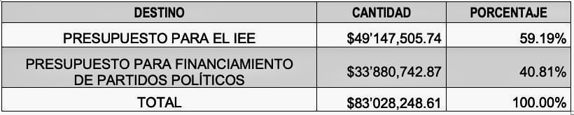 Cabe destacar que del total señalado, únicamente $49’147,505.74 serán para la operatividad y funcionamiento eficaz de la institución electoral local durante el próximo año. Asimismo, se da cumplimiento de la obligación constitucional de incluir $33’880,742.87 en el presupuesto de egresos, para el financiamiento público que conforme al Código Electoral del Estado, los Partidos Políticos tienen derecho a recibir de manera ordinaria, así como para el sostenimiento de sus actividades.