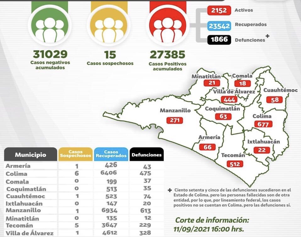 Registra Colima 193 casos nuevos y 23 muertes por Covid-19.