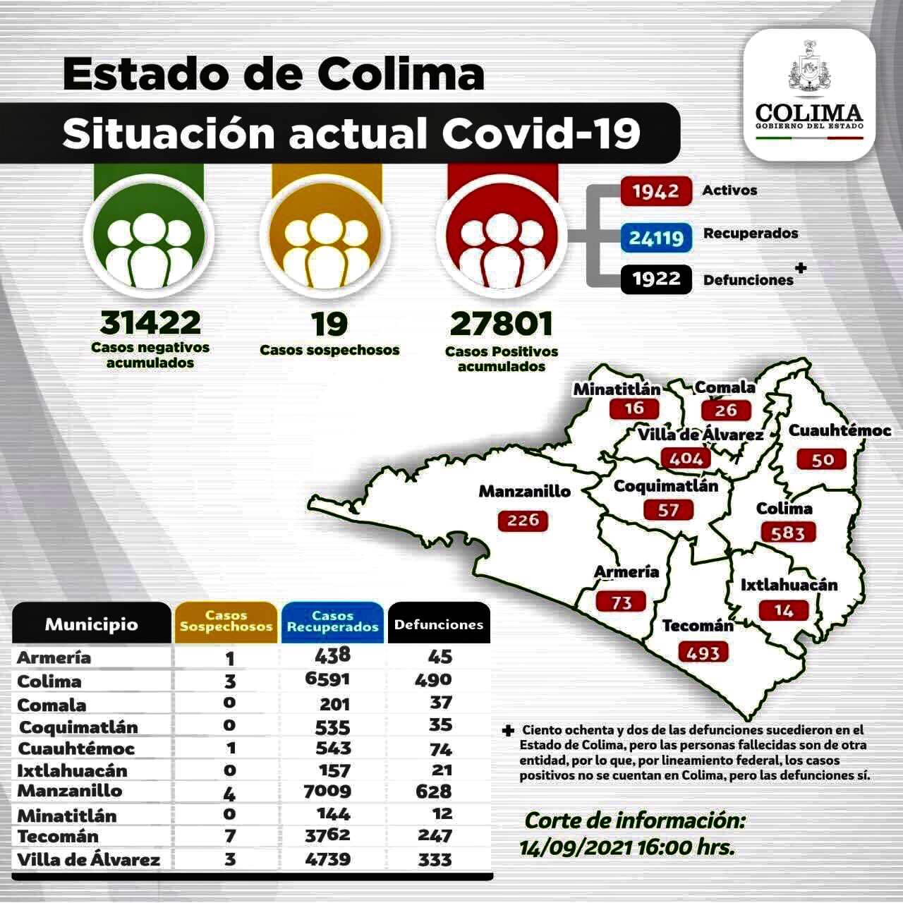 En el reporte de este día las instituciones del Sector Salud informaron que durante la última jornada Colima registró 226 casos nuevos y 18 decesos por Covid-19, para alcanzar los 27 mil 801 positivos y mil 922 fallecimientos acumulados por esta causa en la entidad.