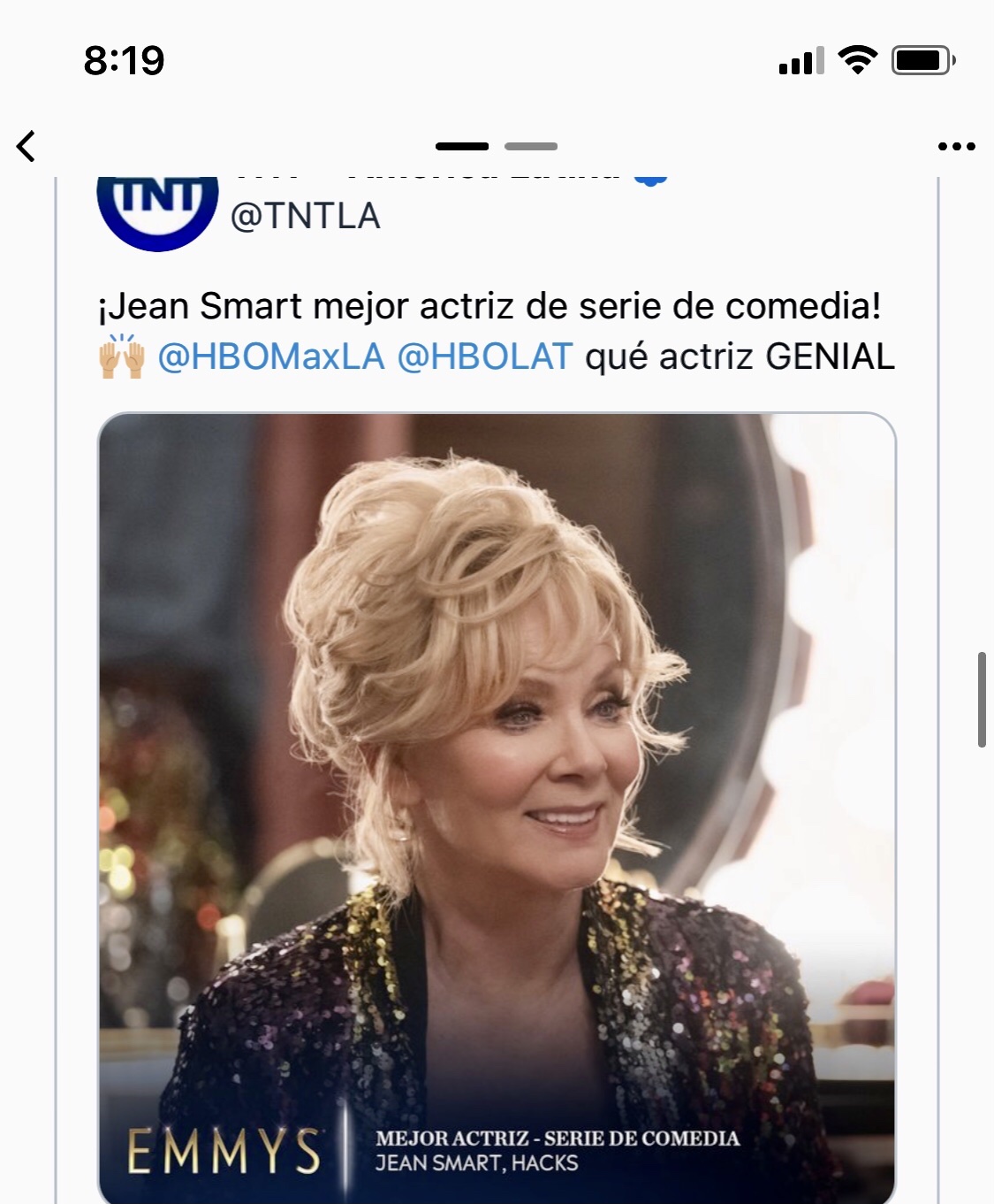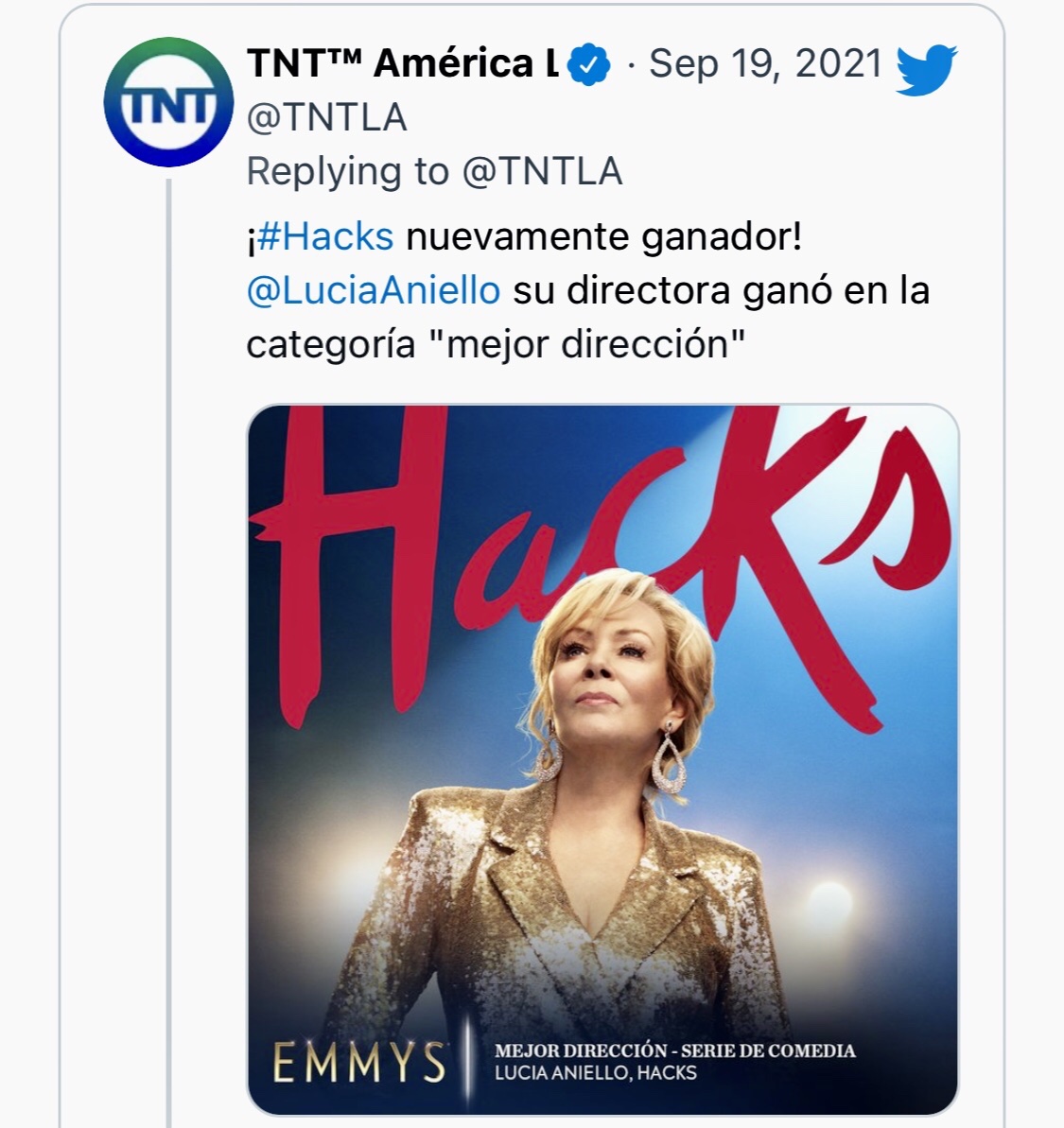 La hilarante serie Hacks fue reconocida como Mejor guión para una serie de comedia, a su directora, Lucia Aniello, la premiaron con la Mejor dirección en esa categoría y a Jean Smart le dieron el galardón de Mejor Actriz de comedia por esa misma producción.