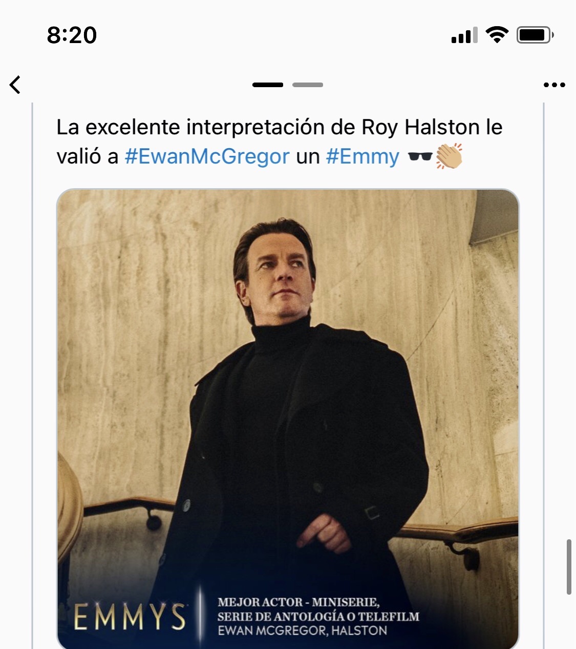 Otro viejo conocido del cine prosiguió a Winslet para recibir la estatuilla en la categoría de mejor actor en una serie limitada, Ewan McGregor se hizo del honor gracias a su interpretación en Halston, en la cual dio vida al famoso diseñador de modas.