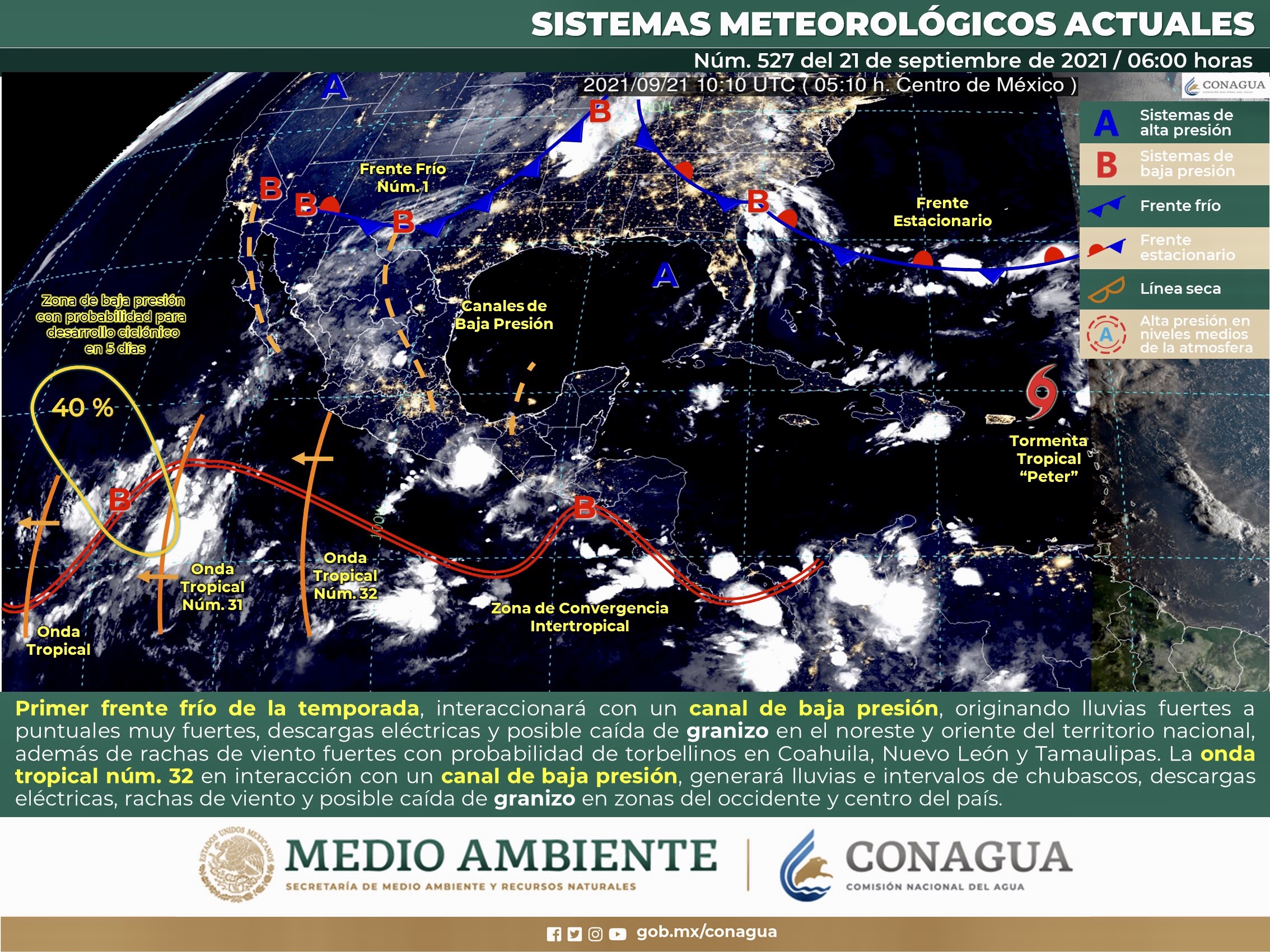 Este día, el ingreso del primer frente frío de la temporada sobre el norte y noreste de México, interaccionará con un canal de baja presión en el noreste y oriente del territorio nacional, originando lluvias fuertes a puntuales muy fuertes, descargas eléctricas y posible caída de granizo en las regiones mencionadas, además de rachas de viento fuertes con probabilidad para la formación de torbellinos en Coahuila, Nuevo León y Tamaulipas. Por otra parte, la onda tropical Núm. 32 al sur de Jalisco y Colima en interacción con un canal de baja presión en el occidente y centro del país, generarán lluvias e intervalos de chubascos, descargas eléctricas, rachas de viento y posible caída de granizo en dichas regiones.
