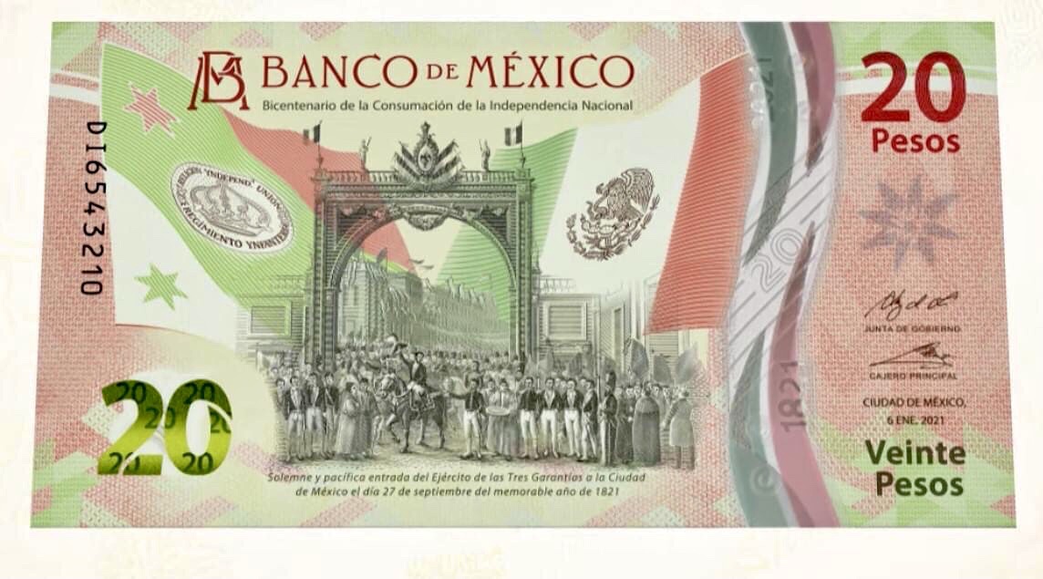 Como una edición conmemorativa por los 200 años de la Consumación de la Independencia de México se emitió un nuevo billete de 20 pesos.
