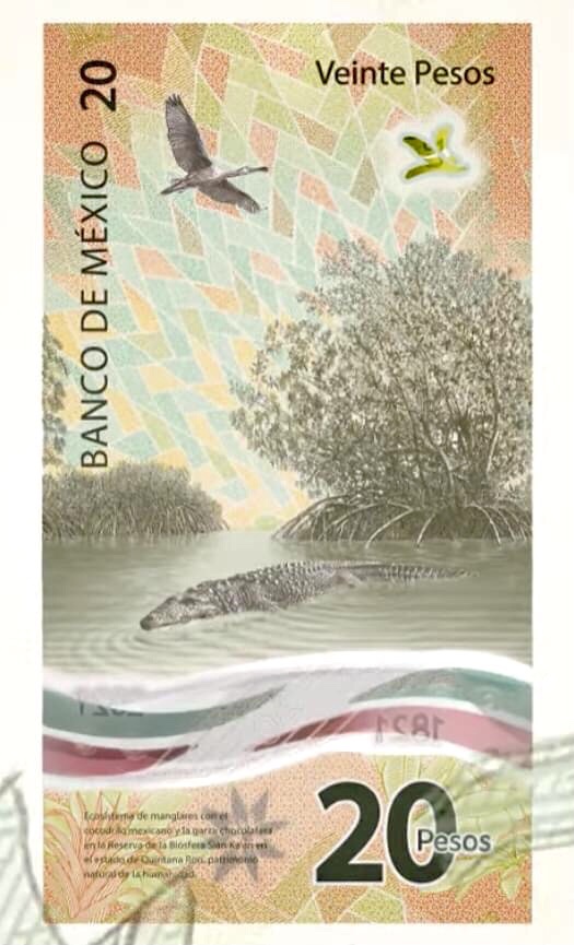 En el reverso se representa el ecosistema de manglares de la Reserva de la Biósfera de Sian Ka’an, en el estado de Quintana Roo.