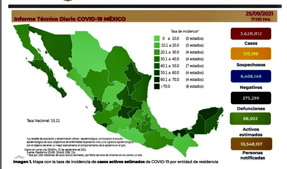 La Secretaría de Salud informó este sábado que México ya suma 3 millones 628 mil 812 contagios y 275 mil 299 muertes por esta causa.