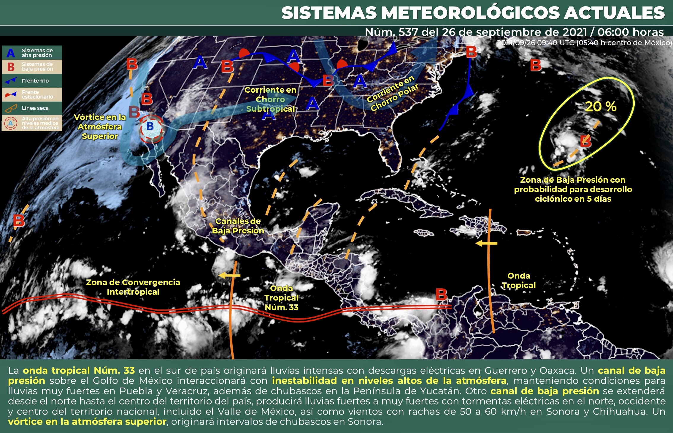 Para el día de hoy, la onda tropical Núm. 33 recorrerá el sur de país y originará lluvias puntuales intensas acompañadas de descargas eléctricas en Guerrero y Oaxaca. Asimismo, un canal de baja presión permanecerá sobre el Golfo de México interaccionará con inestabilidad en niveles altos de la atmósfera, manteniendo las condiciones para lluvias muy fuertes en Puebla y Veracruz, además de chubascos en la Península de Yucatán. Otro canal de baja presión se extenderá desde el norte hasta el centro del territorio del país, este sistema producirá lluvias fuertes a muy fuertes con tormentas eléctricas en el norte, occidente y centro del territorio nacional, incluido el Valle de México, así como vientos con rachas de 50 a 60 km/h en Sonora y Chihuahua. Un vórtice en la atmósfera superior, originará intervalos de chubascos en Sonora. Finalmente, prevalecerá ambiente muy caluroso en la Península de Yucatán y en zonas del noroeste del territorio nacional.