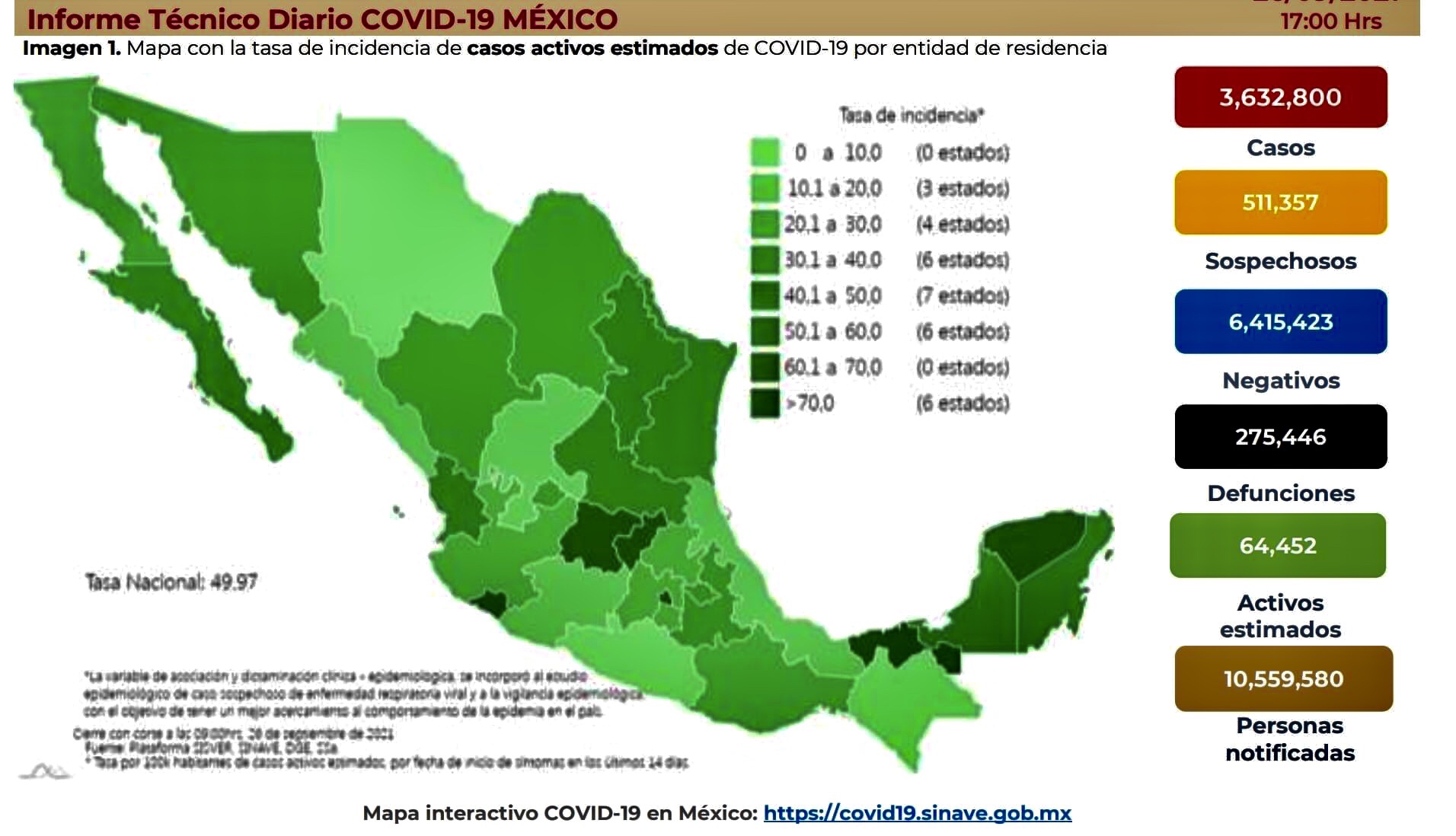 La Secretaría de Salud informó este domingo que México suma 3 millones 632 mil 800 casos y 275 mil 446 muertes por esta causa.