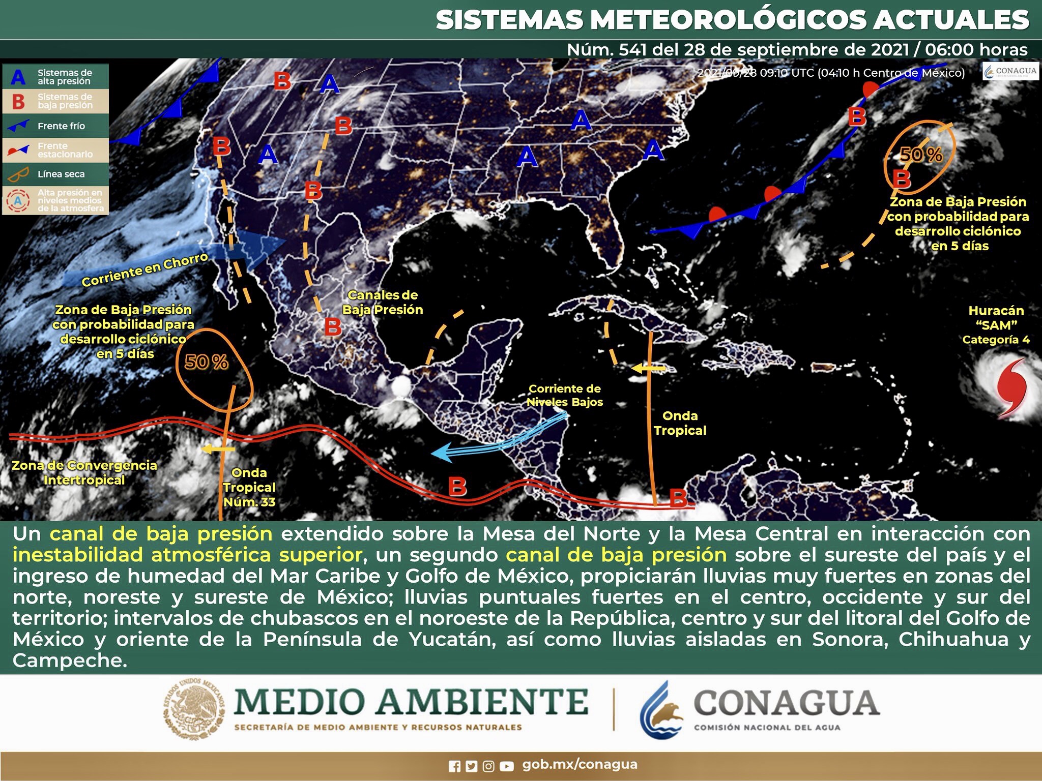 Para hoy, un canal de baja presión se mantendrá extendido sobre la Mesa del Norte y la Mesa Central en interacción con inestabilidad atmosférica superior, un segundo canal de baja presión extendido sobre el sureste del país y el ingreso de humedad del Mar Caribe y Golfo de México, propiciarán lluvias puntuales muy fuertes en zonas del norte, noreste y sureste de México, lluvias puntuales fuertes en el centro, occidente y sur del territorio, intervalos de chubascos en el noroeste de la República, centro y sur del litoral del Golfo de México y oriente de la Península de Yucatán, así como lluvias aisladas en Sonora, Chihuahua y Campeche. Finalmente prevalecerá el ambiente vespertino caluroso sobre zonas de Baja California y entidades del noreste de la República Mexicana, así como en la Península de Yucatán.