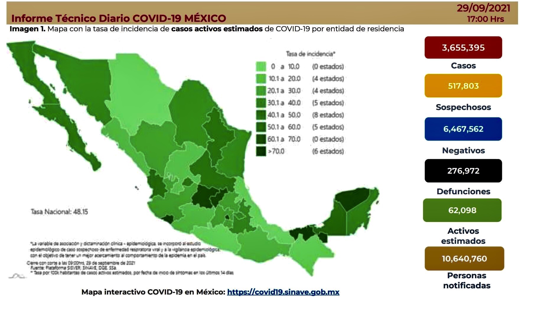 La Secretaría de Salud informó que suman 3 millones 655 mil 395 casos y 276 mil 972 muertes por esta causa.