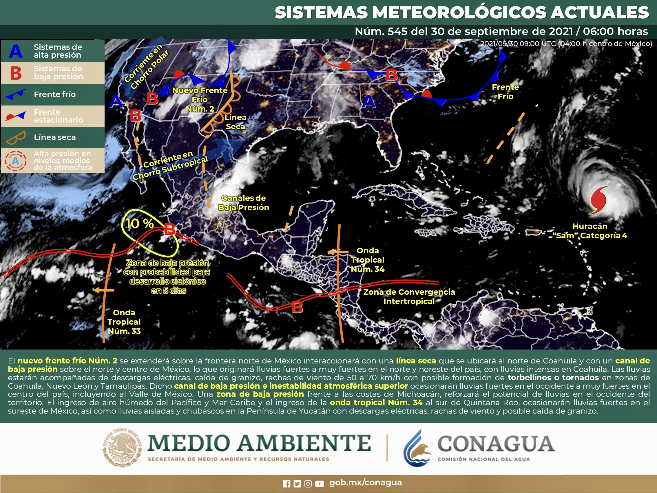 Para hoy, se prevé la aproximación e ingreso del nuevo frente frío Núm. 2 que se extenderá sobre la frontera norte de México. Este sistema interaccionará con una línea seca que se ubicará al norte de Coahuila y con un canal de baja presión sobre el norte y centro de México, lo que originará lluvias puntuales fuertes a muy fuertes sobre el norte y noreste del país, con lluvias puntuales intensas en Coahuila. Las lluvias estarán acompañadas de descargas eléctricas, caída de granizo, rachas de viento de 50 a 70 km/h con posible formación de torbellinos o tornados en zonas de Coahuila, Nuevo León y Tamaulipas. Dicho canal de baja presión e inestabilidad atmosférica superior ocasionarán lluvias fuertes en el occidente a muy fuertes en el centro del país, incluyendo al Valle de México. Una zona de baja presión frente a las costas de Michoacán, reforzará el potencial de lluvias en el occidente del territorio. Finalmente, el ingreso del aire húmedo del Pacífico y Mar Caribe y el ingreso de la onda tropical Núm. 34 al sur de Quintana Roo, ocasionarán lluvias fuertes en el sureste de México, así como lluvias aisladas y chubascos en la Península de Yucatán, las cuales estarán acompañadas de descargas eléctricas, rachas de viento y posible caída de granizo.