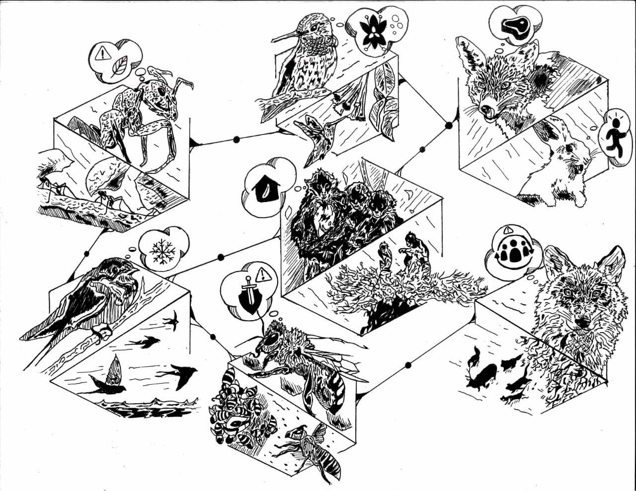 En entrevista, el estudiante explicó que el dibujo con que participó tiene por nombre “La omnipresencia de una red vital”, y en él hace referencia a la relación entre la Neuroetología y las interacciones ecológicas; “decidí ilustrar distintas situaciones que ocurren en la naturaleza y trato de explicar cómo una interacción ecológica puede desencadenar un comportamiento en una especie (a nivel neuronal) o viceversa”.