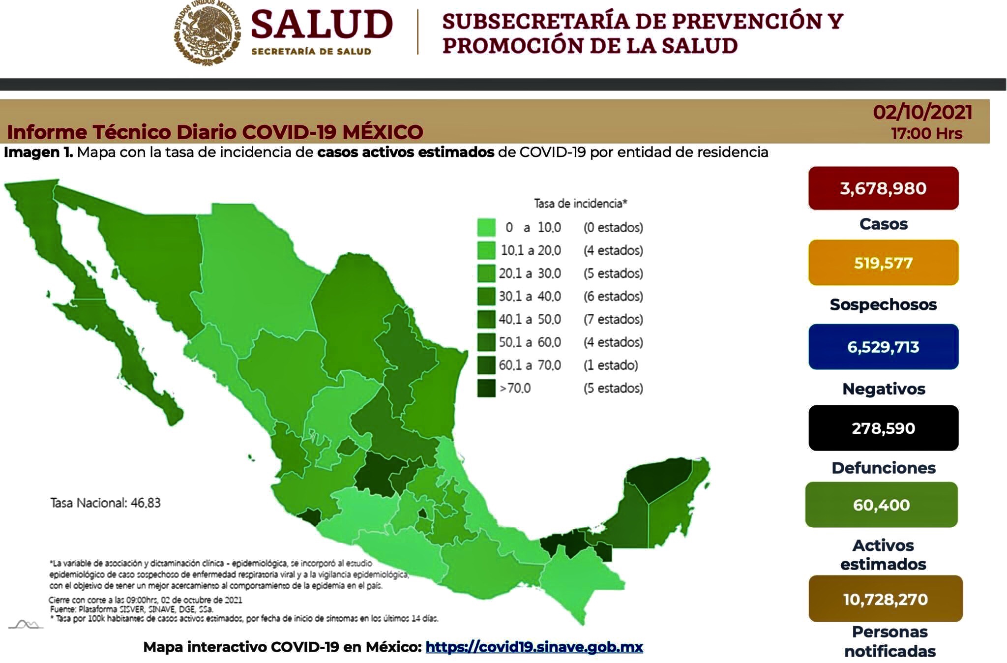 La Secretaría de Salud informó este sábado que México suma 3 millones 678 mil 980 casos positivos y 278 mil 590 muertes por esta causa.