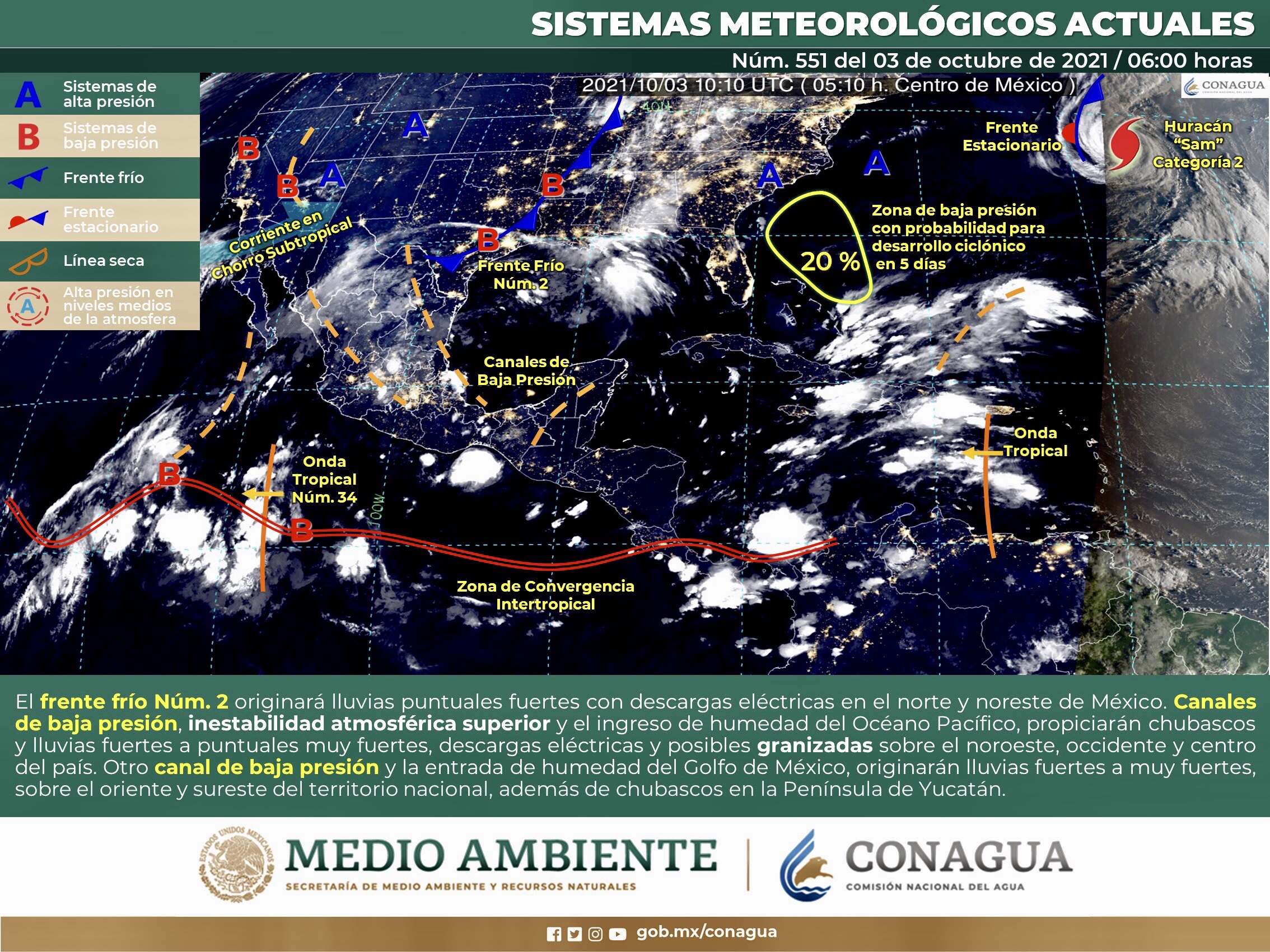 Este día, el frente frío Núm. 2 prevalecerá sobre el norte y noreste de México, generando lluvias puntuales fuertes y descargas eléctricas en dichas regiones. Por otra parte, canales de baja presión, el primero extendido frente a las costas de Jalisco y el segundo desde el occidente hasta el centro del país, aunado a inestabilidad atmosférica superior y al ingreso de humedad del Océano Pacífico, propiciarán chubascos y lluvias fuertes a puntuales muy fuertes, descargas eléctricas y posibles granizadas sobre el noroeste, occidente y centro del territorio nacional. Un tercer canal de baja presión sobre el oriente y sureste del territorio nacional, además de la entrada de humedad del Golfo de México, originarán lluvias fuertes a muy fuertes, descargas eléctricas y posible caída de granizo en las regiones mencionadas, además de chubascos en la Península de Yucatán.