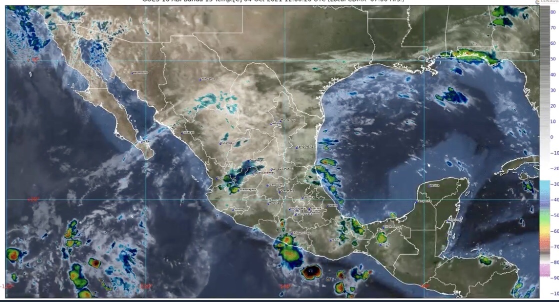 Para el Pacífico Centro se estima ambiente fresco con bancos de niebla por la mañana y ambiente cálido hacia la tarde. Se prevé cielo nublado la mayor parte del día, descargas eléctricas y posible caída de granizo en Jalisco y Michoacán, además de viento de componente oeste de 10 a 25 km/h en la región, con rachas de 40 km/h en zonas de tormenta.