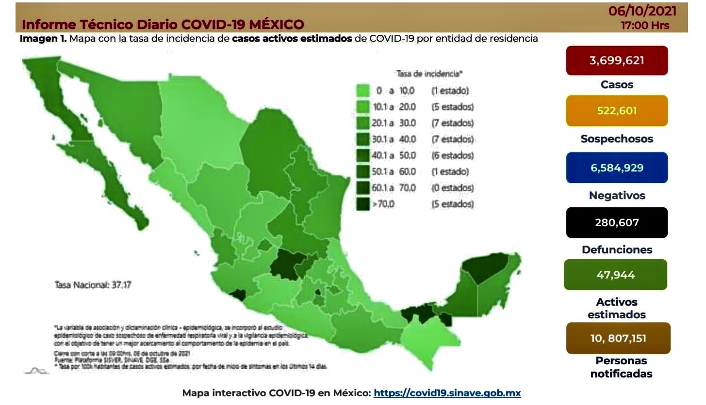 La Secretaría de Salud informó este miércoles que México suma 3 millones 699 mil 621 casos y 280 mil 607 muertes por esta causa.