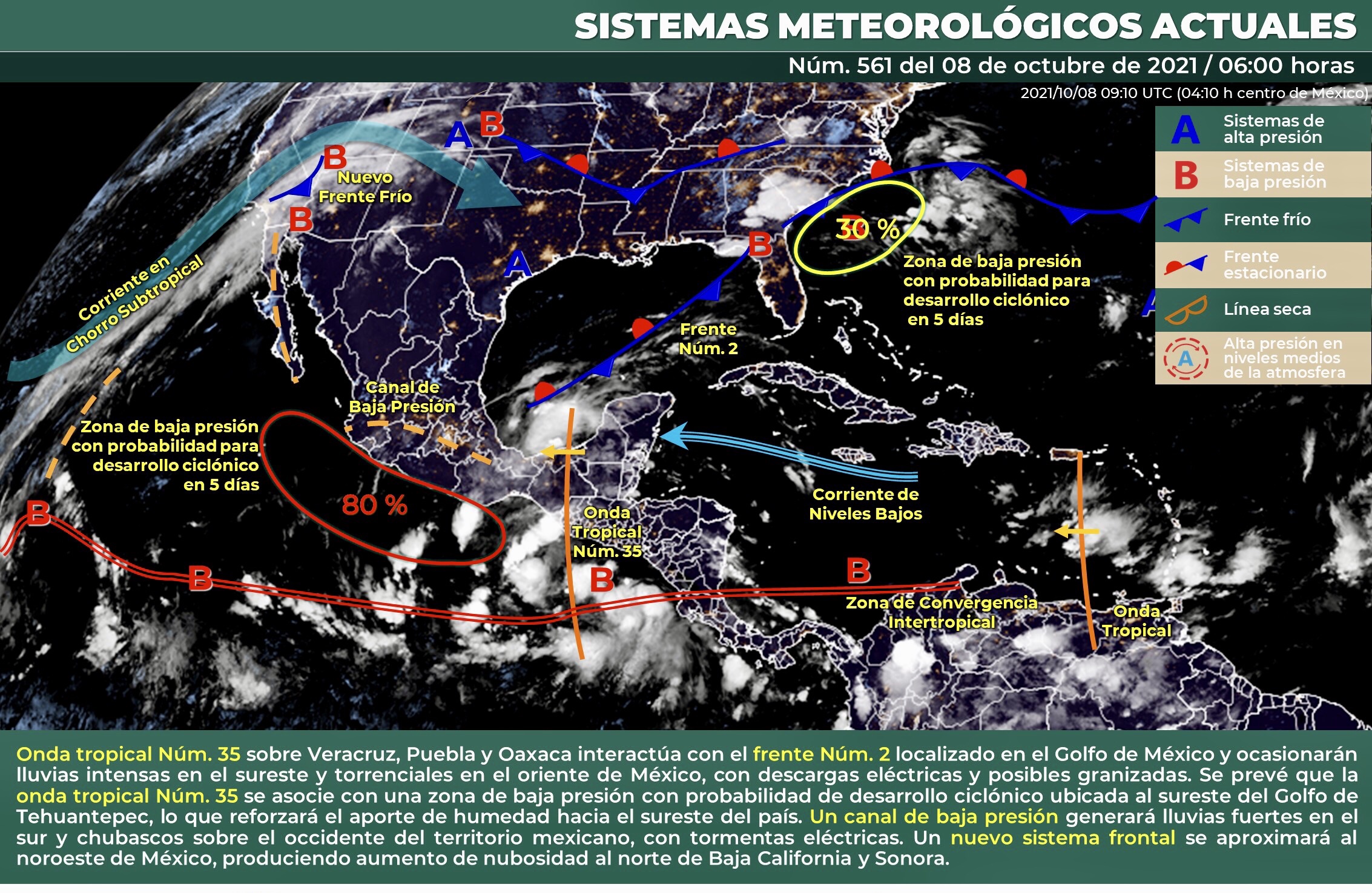Para hoy, se pronostica que la onda tropical Núm. 35 se desplace sobre Veracruz, Puebla y Oaxaca, y que interactúe con el frente Núm. 2 que se localizará sobre el Golfo de México, ocasionando lluvias intensas en el sureste y torrenciales en el oriente de México, acompañadas de descargas eléctricas y posibles granizadas, las cuales podrían generar incremento en los niveles de ríos y arroyos, deslaves e inundaciones. También, se prevé que la onda tropical Núm. 35 se asocie con una zona de baja presión con probabilidad de desarrollo ciclónico ubicada al sureste del Golfo de Tehuantepec, lo que reforzará el aporte de humedad hacia el sureste del país. Por otra parte, un canal de baja presión generará lluvias fuertes en el sur y chubascos sobre el occidente del territorio mexicano, con tormentas eléctricas. Un nuevo sistema frontal se aproximará al noroeste del país, produciendo aumento de nubosidad al norte de Baja California y Sonora. Finalmente, persistirá el ambiente muy caluroso por la tarde con temperaturas máximas superiores a 40°C en zonas de Sonora y Sinaloa.