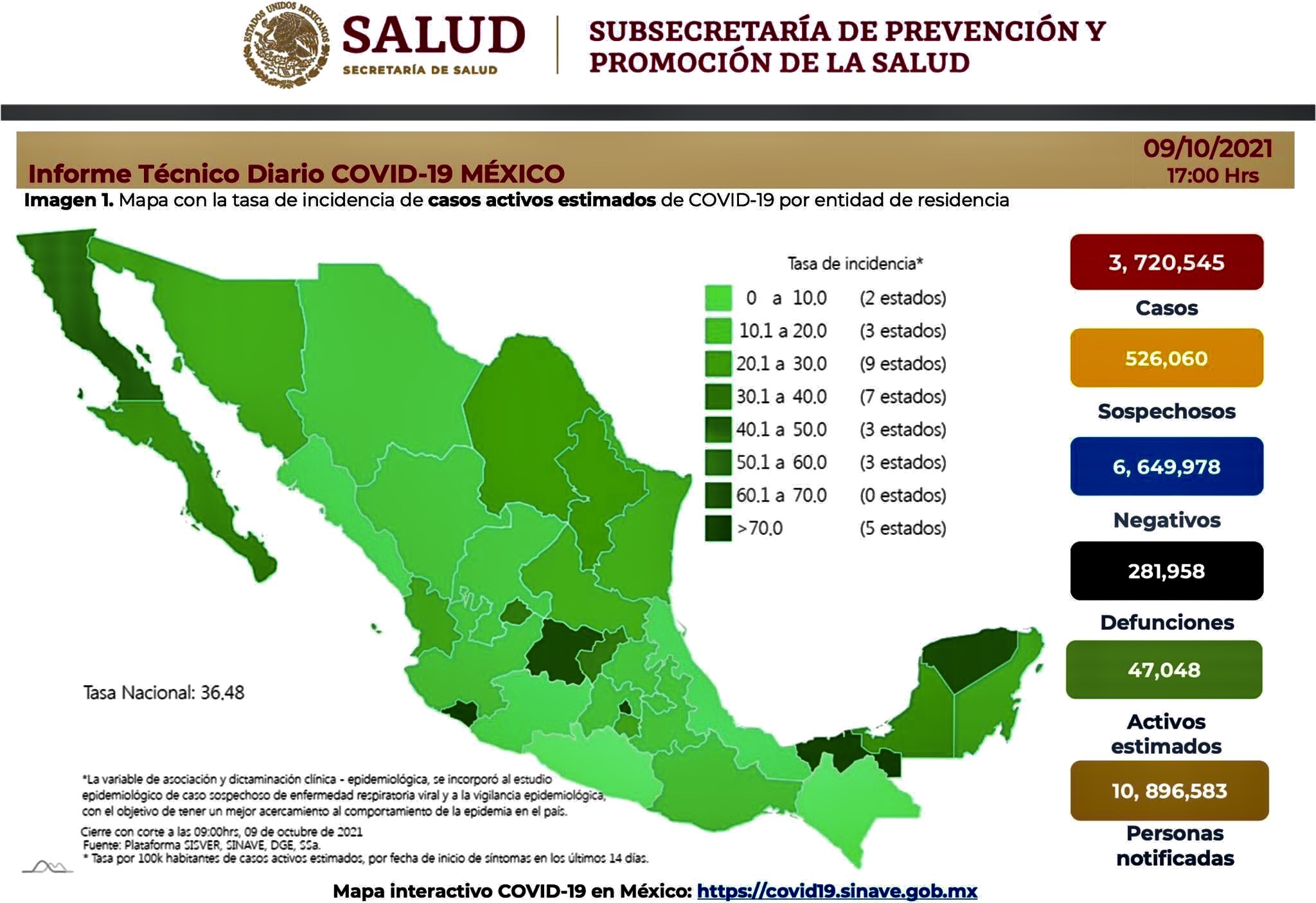 Este sábado, México suma tres millones 720 mil 545 casos y 281 mil 958 muertes por esta causa.