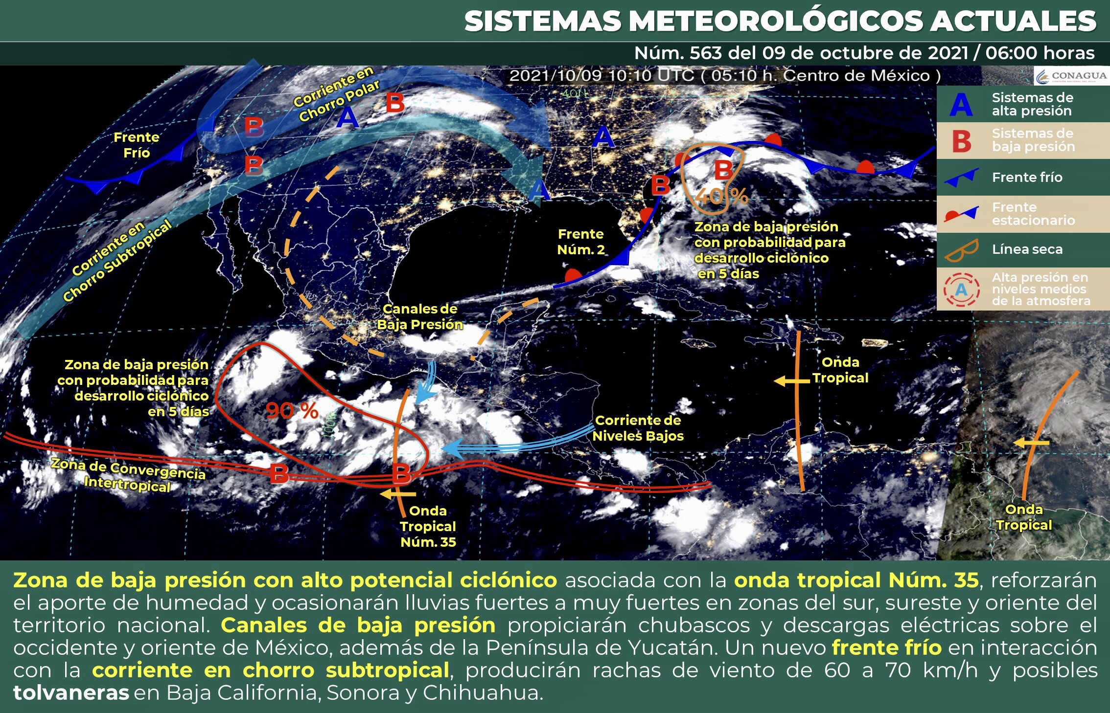 Este día, la zona de baja presión con alto potencial ciclónico asociada con la onda tropical Núm. 35, al sur de las costas de Oaxaca y Guerrero, reforzará el aporte de humedad y ocasionarán lluvias fuertes a muy fuertes en zonas del sur, sureste y oriente del territorio nacional. Canales de baja presión sobre el occidente y oriente de México, originarán chubascos y descargas eléctricas en dichas regiones, incluida la Península de Yucatán. Un nuevo frente frío se aproximará a la frontera noroeste del país y en interacción con la corriente en chorro subtropical, producirán rachas de viento de 60 a 70 km/h y posibles tolvaneras en Baja California, Sonora y Chihuahua. Finalmente, prevalecerá ambiente caluroso sobre zonas de Baja California Sur, Sonora (sur) y Sinaloa, así como en la Península de Yucatán.