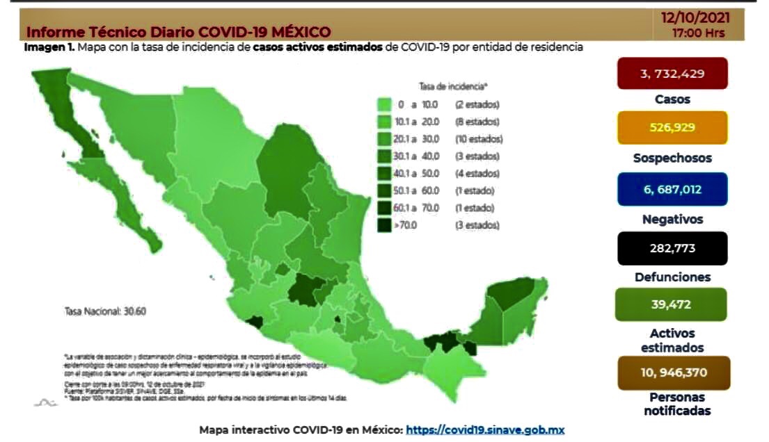La Secretaría de Salud informó que México suma 3 millones 732 mil 429 casos y 282 mil 773 muertes por COVID-19.