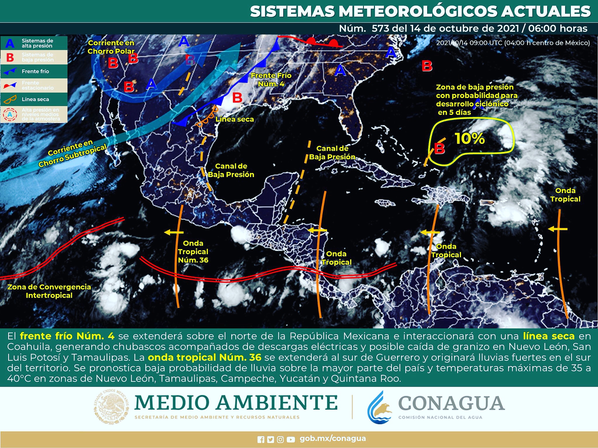Para hoy, el frente frío Núm. 4 se extenderá sobre el norte de la República Mexicana e interaccionará con una línea seca en Coahuila, generando chubascos acompañados de descargas eléctricas y posible caída de granizo en Nuevo León, Tamaulipas y San Luis Potosí. Por otro lado, la onda tropical Núm. 36 se extenderá al sur de Guerrero y mantendrá las condiciones para lluvias fuertes en el sur del territorio. Finalmente, se pronostica baja probabilidad de lluvia sobre la mayor parte del país y temperaturas máximas de 35 a 40°C en zonas de Nuevo León, Tamaulipas, Campeche, Yucatán y Quintana Roo.